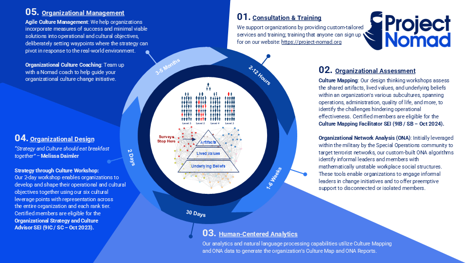 Project Nomad is a grassroots effort by service members for service members designed to help organizations improve their operational effectiveness through human-centered systems thinking. Our services are free unless in-person support is requested.